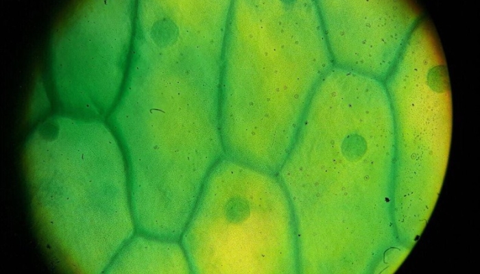 IMÁGENES 3 Y 4: preparado de epidermis de cebolla teñidas por azul de metileno, aquí se pueden observar la típica estructura de las células vegetales. Fueron observadas con objetivos de menor y mayor aumento respectivamente.